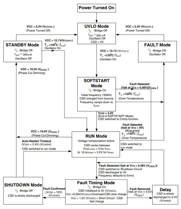 6. В случае возникновения аварии и в зависимости от характера этой аварии, микросхема может либо самостоятельно перезапускаться (выключать и включать осциллятор, что на сленге называют - "иканием"), до тех пор пока причина аварии не будет устранена, либо перейти в аварийный режим, отключив осциллятор насовсем (триггерная защита). В аварийном режиме микросхема будет находится до того момента, пока ее напряжение питания не снизиться ниже 5,5 В и после этого снова не достигнет положительного порогового значения 11,5 - 12,7 В (для чего требуется физически выключить устройство, дождаться разрядки конденсаторов и снова включить его).