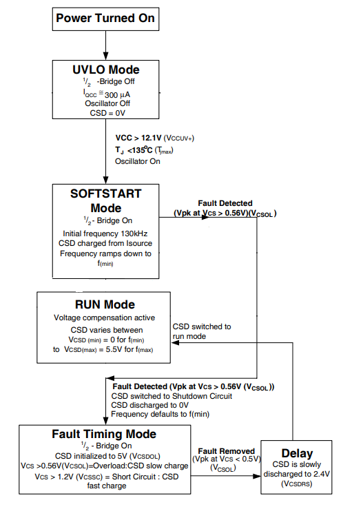 2. Первоначально, частота работы осциллятора - 130 кГц (частота софт-старта). По мере зарядки конденсатора CSD, физически подключенного к одноименному выводу, частота работы осциллятора снижается до рабочего значения. Таким образом работает режим софт-старта в микросхеме;