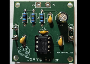 Non-inverting op-amp unity buffer. Single DC power rail. 40mm x 40mm PCB with 3mm mounting holes. ...