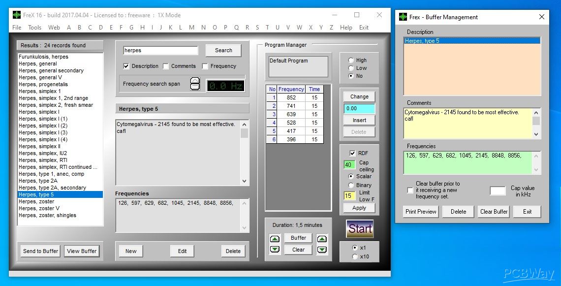 This part serves to generate a series of frequencies with a certain duration that depend on the type of treatment and type of disease. For this purpose, we will use the personal computer as the simplest solution, and with the help of advanced Free software, we will send the frequencies to the modulator through the sound card. The software is "Frex 16" (http://www.spectrotek.com/frex/) and you can freely download it at the given address.