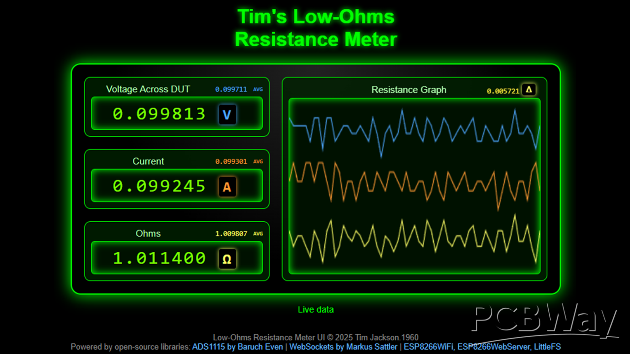 This project is a compact, high‑accuracy 4‑wire (Kelvin) low‑ohms meter designed for measuring resistances from milliohms up to several ohms with excellent stability. It uses an ADS1115 16‑bit ADC, a precision current source, and an ESP8266 to provide both a local OLED display and a full real‑time web interface over Wi‑Fi.