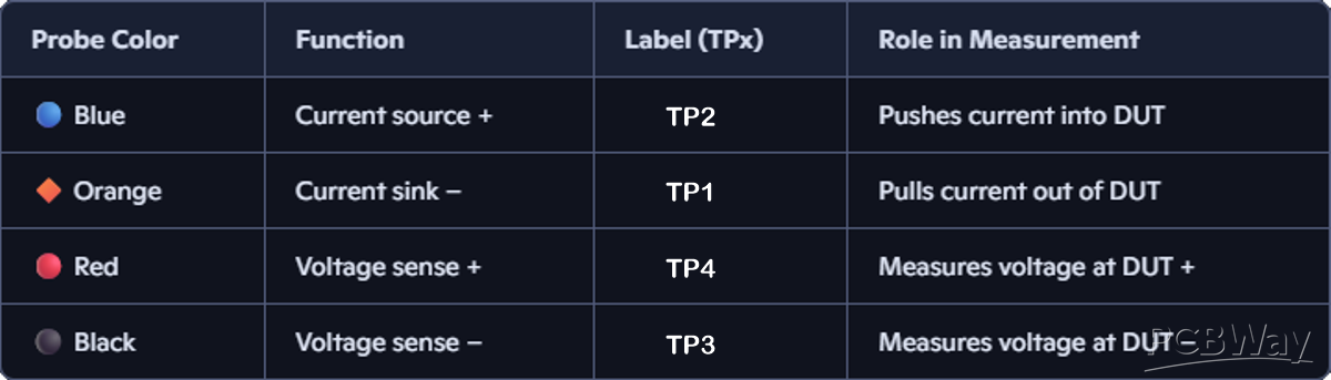 This eliminates lead resistance and contact errors, enabling accurate milliohm measurements.