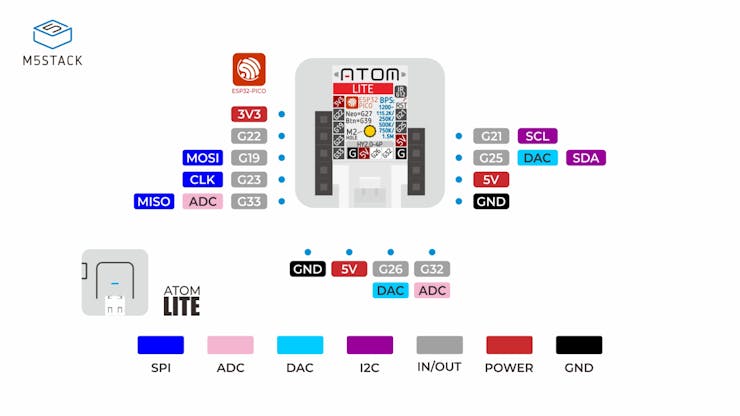 In addition to the Grove connector, the bottom of the Atom Lite has two headers that expose 5V and GND power pins, a 3.3V output, and six GPIO pins that can be used to connect external circuits.