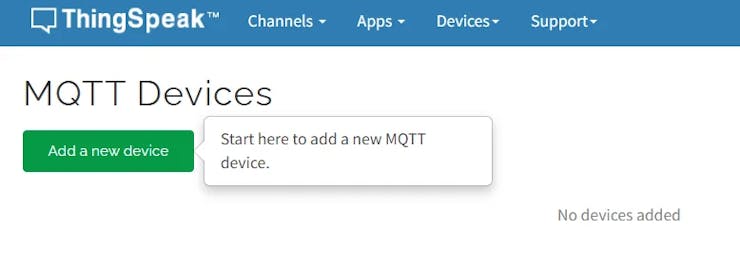 To use the ThingSpeak MQTT server, you first need to configure a device. From the main menu, go to Devices > MQTT and click the Add a new device button.