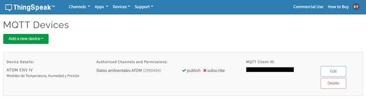 In the image above, you can see my device’s MQTT configuration on ThingSpeak. It’s authorized to publish, but not to subscribe, since I don’t plan to receive data from the broker in this project.