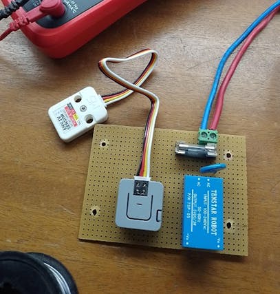 To run the first tests, I built a prototype like the one shown in the image below, using a multipurpose board. The connection to the mains wires is made through a screw terminal block. All components are soldered to the board, except for the ENV IV unit, which is connected to the Atom Lite via a Grove cable.