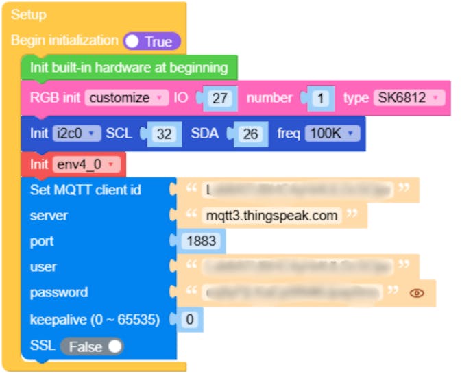 Initialization: The hardware is initialized, including the RGB LED, I2C bus, and ENV IV unit. MQTT connection parameters (URL, username, and password) are also set up.