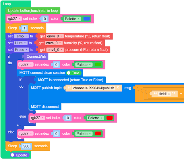 Loop: The program reads data from the ENV unit, connects to the Wi-Fi network, establishes an MQTT connection, and sends the variable values to the server. Then it waits for 15 minutes before repeating the cycle.