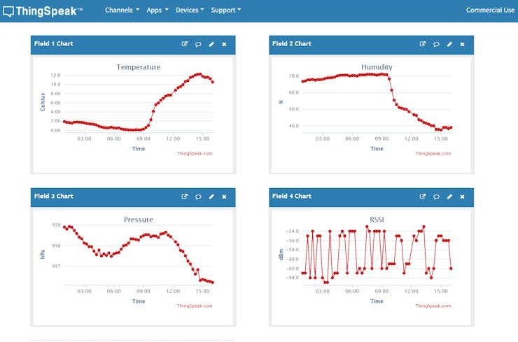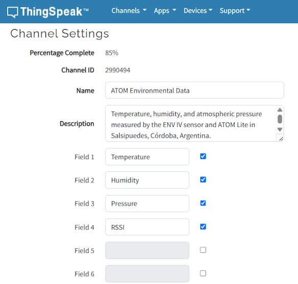 For this project, I created a channel with four fields to store temperature, humidity, atmospheric pressure, and Wi-Fi signal strength (RSSI). The last one isn’t related to weather, but it’s useful for checking signal quality in different installation spots.