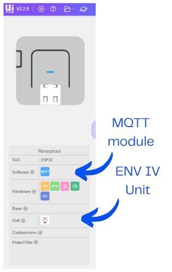 Before starting to build the program, UIFlow needs to be configured to include the hardware units and software modules you’ll use. In this case, you'll need to add the ENV IV unit and the MQTT module.
