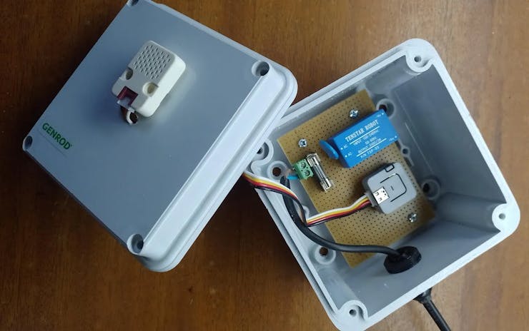 With the program uploaded, I mounted the assembled board inside a weatherproof plastic enclosure, suitable for protecting the electronic components. The ENV IV unit was attached to the lid using double-sided tape, and the cables pass through a rectangular hole made in the same lid.