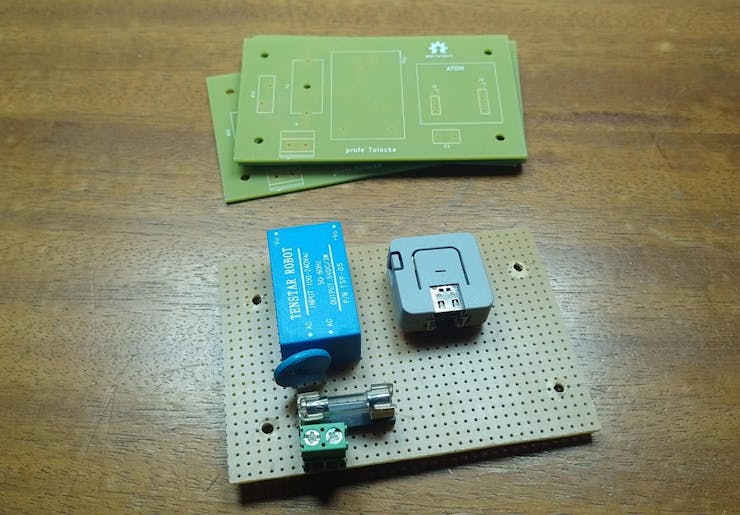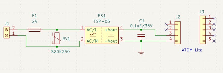 The circuit includes a power supply module that converts mains voltage (220V in my country) to 5V, which powers the Atom Lite. As basic protection, I added a varistor (S20K250 or similar) at the input to guard against transient overvoltages, and a 2A fuse that will blow if the varistor activates. (When an overvoltage occurs, the varistor conducts, draws high current, and the fuse blows—protecting the power supply module)