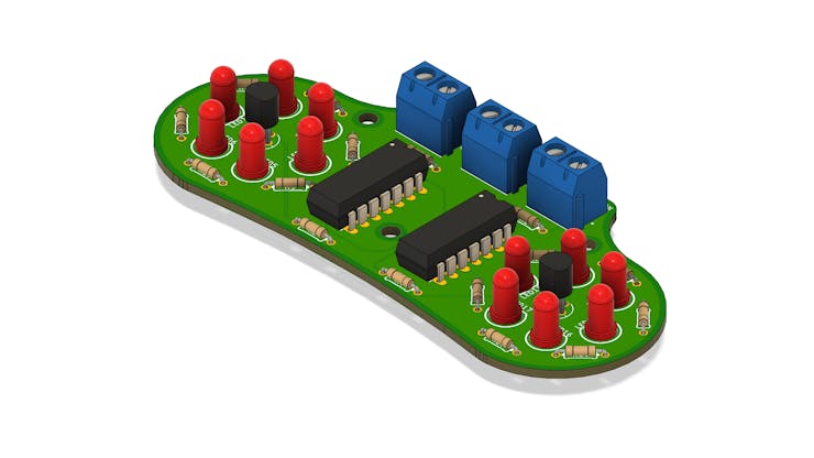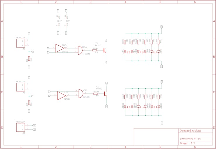 The electronic circuit is formed by a group of LEDs that will be used to signal that a cyclist will turn left or right. This will be done through the use of two buttons.