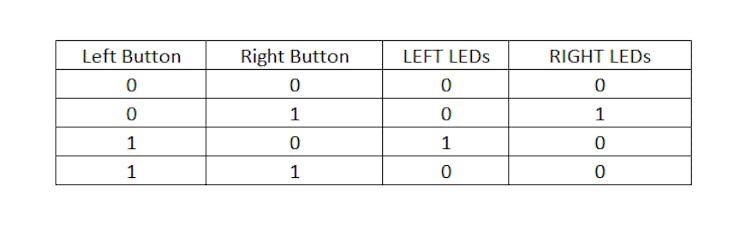 The combinational circuit is formed by two inputs, which are the left button and the right button.