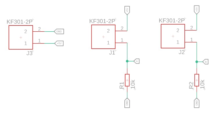 We have a connector for powering the electronic project with a +5V battery. The other 2 connectors will be used to connect the buttons. A 10kR pull-down resistor was inserted for each button.