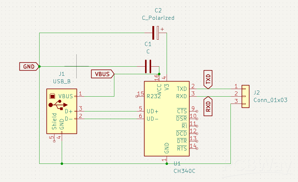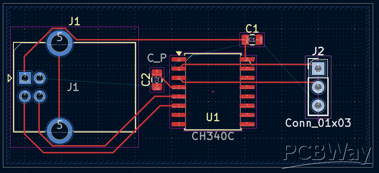 This project is a compact and manufacturable USB-to-UART converter based on the CH340C, designed for reliable serial communication in embedded development workflows by leveraging the CH340C’s internal oscillator, the design minimizes component count while maintaining stable Full-Speed USB operation. The board uses a robust USB-B connector, proper power decoupling, and a simple 2-layer layout to ensure ease of fabrication and assembly. It provides a clean TX/RX/GND.