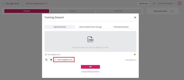 Copy the serial monitor output of the two motions in a text file and rename it to “trainingdata.csv”.
