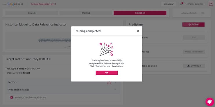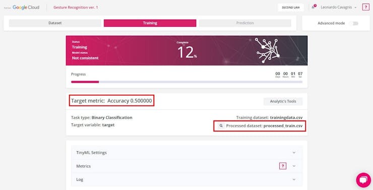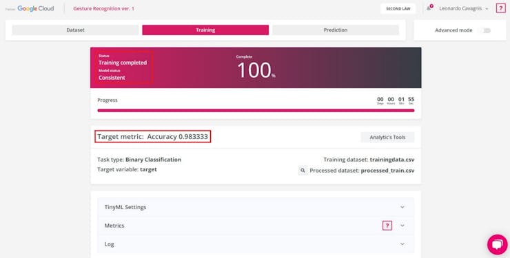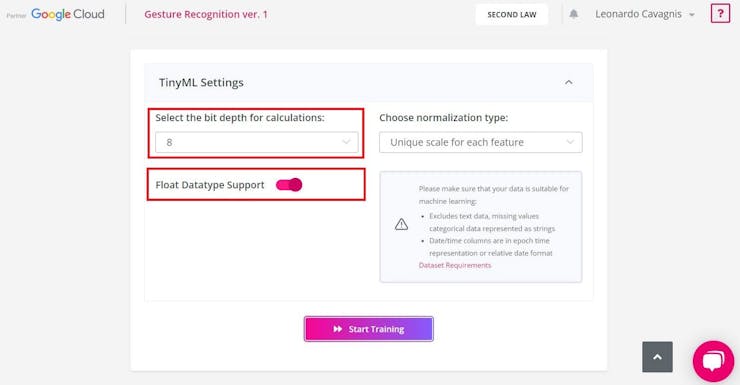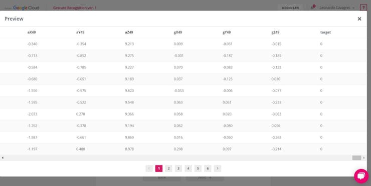 You will perform at least 60 motions: 30 for the first movement (punch) and 30 for the second one (flex). For each motion, you will acquire 50 acceleration and 50 gyroscope measures in a 1 second time window (Sampling time: 20ms —50Hz). In this experiment, 60 motions are enough. By increasing the number of motion measurements, you can improve the predictive power of the model. However, a large dataset can lead to an over-fitted model. There is no “correct” dataset size, but a “trial and error” approach is recommended.