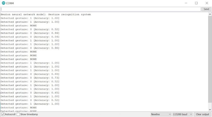The easiest way to achieve this is to repeat several times the same two motions (punch and flex), by capturing acceleration and gyroscope measurements and storing the result in a file.To do this, you create an Arduino sketch dedicated to sensor data acquisition. The program will acquire the measurements of each motion and will print the sensor measurements output on the serial port console.