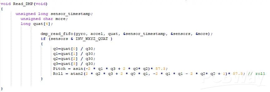 With the I2C read/write function and delay function, reading data from the MPU6050 is no longer an issue. The next step is to read the MPU6050's ID to ensure proper communication; configure the MPU6050, set its clock, and configure the acceleration and gyroscope ranges, etc. After that, call the DMP library's API to initialize the MPU and DMP, and read the DMP data to calculate the attitude angles.