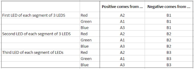 Here is how my LED strip looks like. The strip is divided into segments, each segment hosting 3 RGB LEDs: