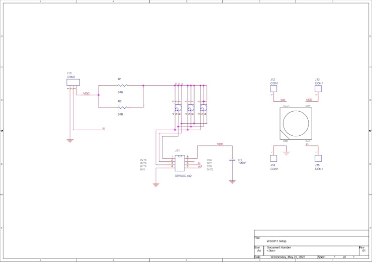 To Get started, I first search for WS2811 IC's Datasheet and used one of its given example layouts to prepare a simple schematic that has 3 LEDs in series and 3 in parallel.