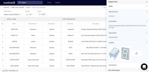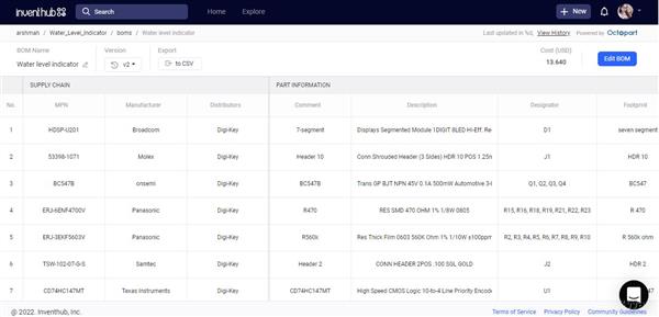 I have created a bill of materials online on Inventhub that contains the details of my components. To embed components on the board, I can send this file in CSV format to my component provider. He can deliver the components easily as per design requirements. I can calculate the total cost of my project by clicking on ‘Supply Chain’. My total cost is $13.640 as per the choice of my supplier, manufacturer, and availability of the component.