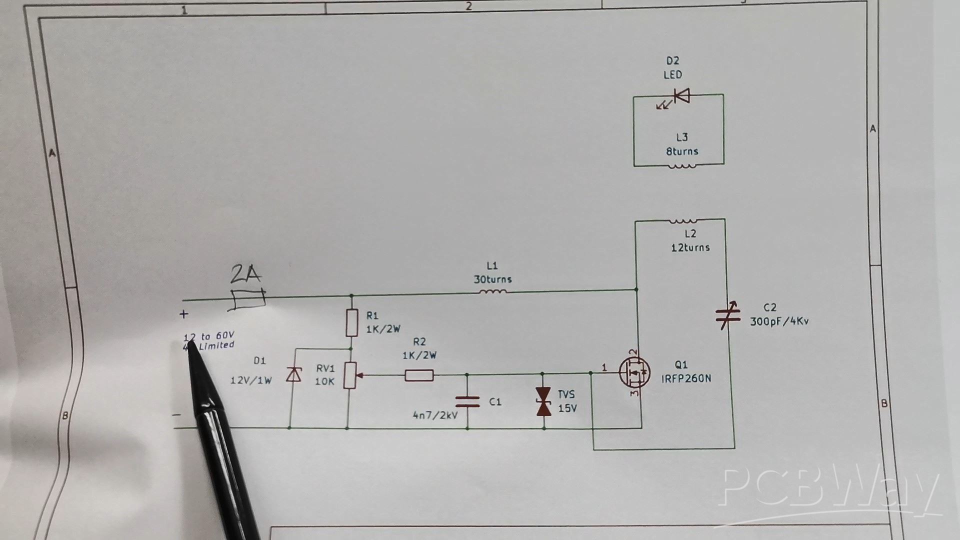 The device is powered by 9 to 60 volts DC and to protect the mosfet, the current at the source is limited to 2A. There is an automatic 2A fuse at the input to turn off the source in case of damage to any of the components. With the potentiometer, we adjust the voltage at the gate, and D1 and TVS serve to protect against parasitic voltage peaks. The oscillation frequency depends on the values of C2 and L2 and with these specific values is about 2 MHz.