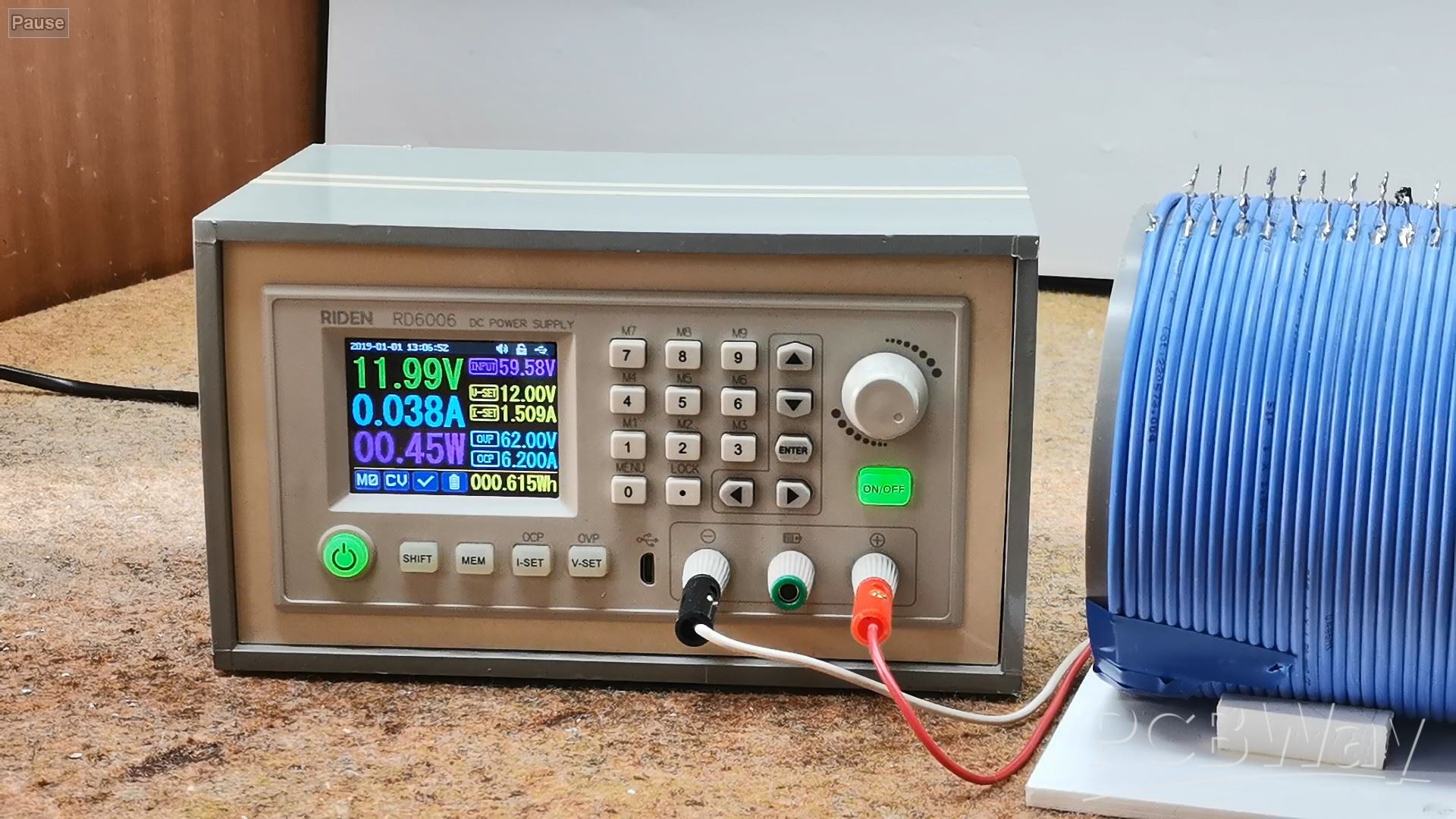 Next comes the interesting part, which is testing. On the Power Supply display, we will monitor the voltage, current, and total power consumed on the transmitter side. Let me tell you that I determined the optimal number of turns on the transmitter and receiver coils experimentally after many hours of testing. The transmitter coil contains 12 turns, and the receiver coil contains 8 turns.