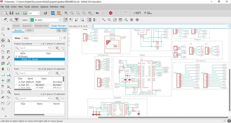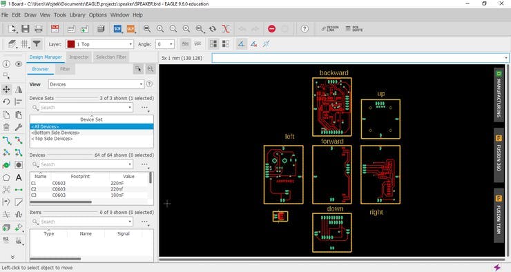 Start by defining the dimensions of the tile on the dimension layer and move all the elements to it. Based on the schematic, the program will tell you what paths you need to create. With a small number of connections, he will even make them for you. When your design will be ready you can check what your PCB looks like with the Online Gerber Viewer and next complete the following steps: