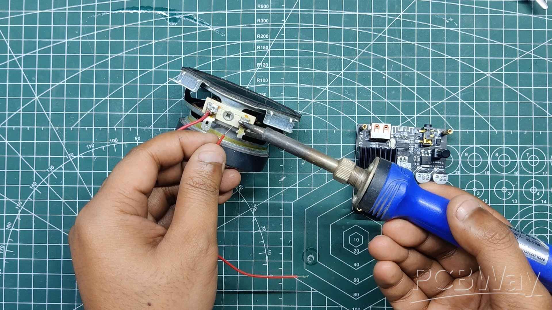 - Using a soldering iron, we begin by connecting two wires to the speaker's positive and negative.