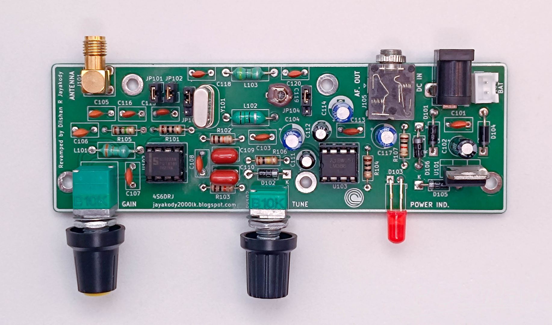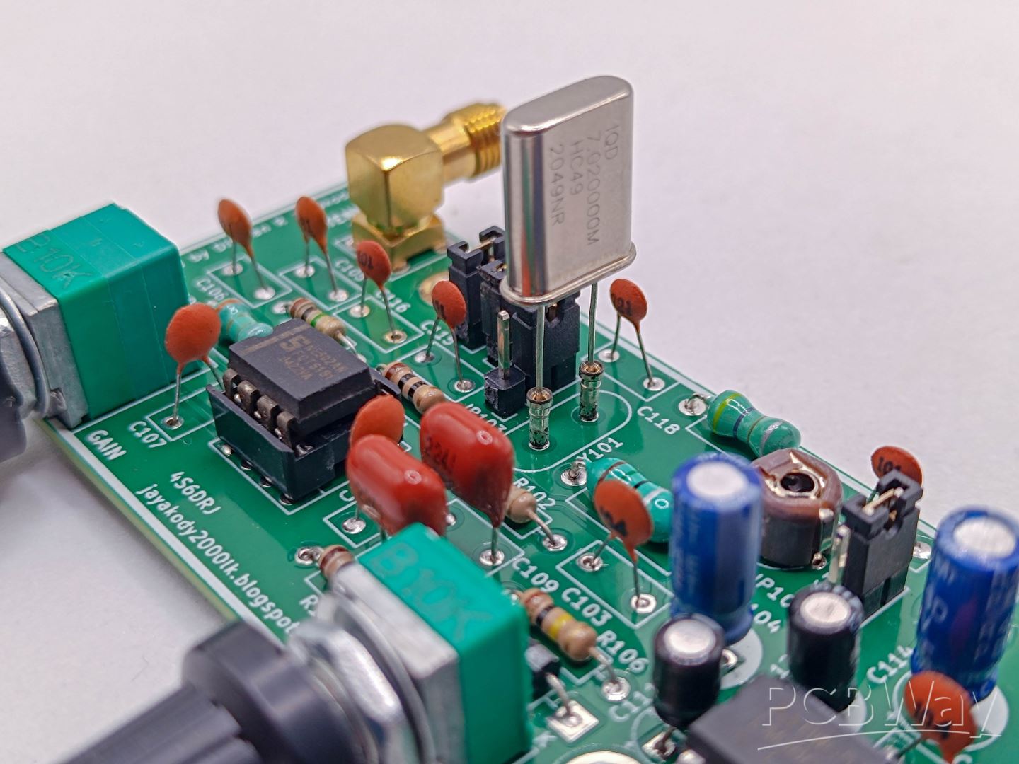 There is also a VFO mode, which uses a 50pF trimmer capacitor for calibration. In my experience, this mode is a bit "drifty" compared to the crystals. You have to do a lot of fine-tuning to keep the station locked in. After the mixer, the signal goes through a low-pass filter and then to an LM386 audio amplifier. I tested both LM386N-1 and LM386N-4 versions, and both worked fine. You can use a small 8Ω speaker, but using low-impedance headphones gives much better audio when listening for weak stations.