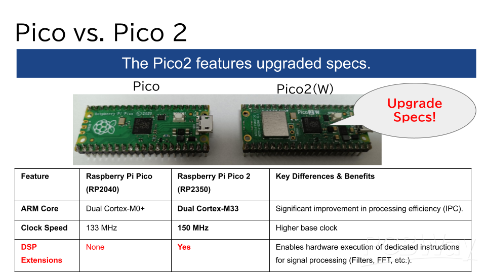 While the Pico 2 (W) features many specification upgrades, the most significant difference is the inclusion of DSP extensions.