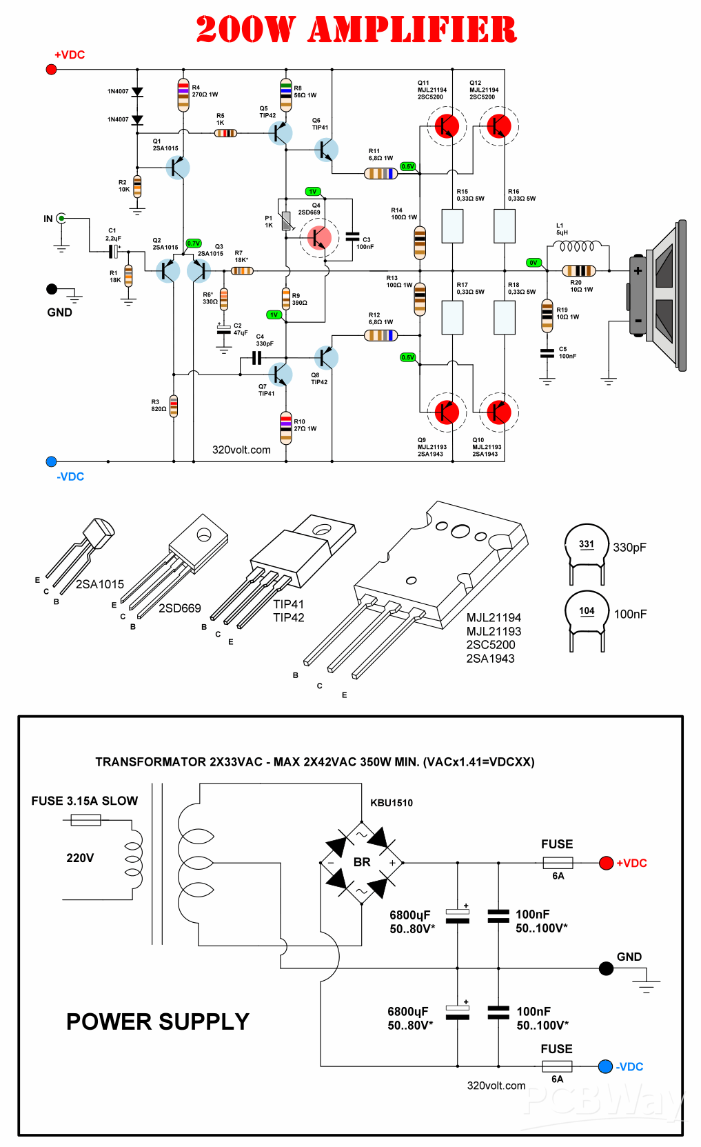 200W Amplifier circuit does not require quiescent current adjustment.200W RMS with 4-OHM speaker100W...