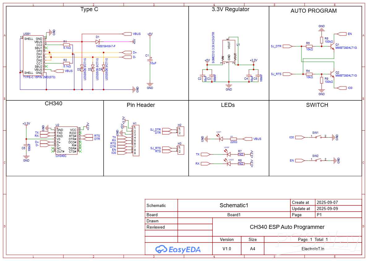Qty Reference Value Part No / Notes 1 U2 CH340C USB-UART bridge 1 U1 SGM2212-3.3 3.3V LDO regulator 2 Q1, Q2 MMBT3904 NPN for auto-program 2 R8, R9 100k Base pulldown resistors 2 R1, R2 10k Base resistors (RTS/DTR) 2 R4, R5 10k Pull-ups (EN, IO0) 1 R3 1k Power LED resistor 2 R6, R7 2.2k TX/RX LED resistors 3 LED1-3 Green/Orange/Yellow Power, TX, RX indicators 3 D2–D4 LESD5D5.0 USB ESD protection 1 D1 1N5819 Reverse protection 5 C1–C5 10 µF Bulk capacitors 3 C3, C5, C6 100 nF Decoupling capacitors 2 SW1, SW2 Reset/Boot buttons Tactile SMD 1 USB1 USB-C connector Receptacle (📑 Full detailed BOM available in Excel file)
