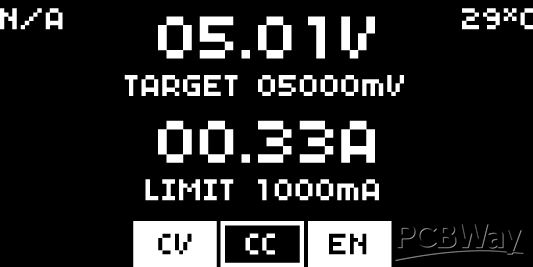 The actual output voltage/current values are periodically read from INA226 and displayed with bigger font while the target/limit referent values are displayed with regular font.