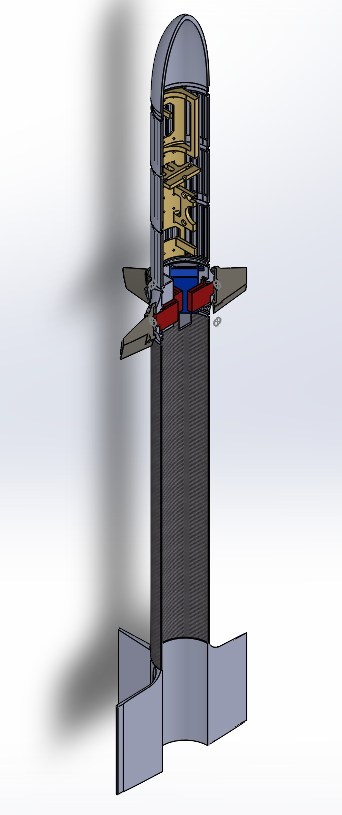 Which I hope to use in simulation software such as ANSYS to better tune the controller gains and improve the aerodynamics of the rocket to reduce the chance of damage on the first flight. The frontal section including avionics bay will be 3D printed, with the final product likely using a stronger engineering filament such as PA-CF. The Design shown above is using the breakout board avionics sled, leading to a significant (~30%) mass increase over what could be done with a compact custom PCB based design.
