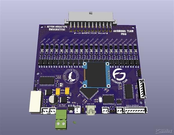 We carry out all the processes related to the vehicle's battery on our PCB board we designed. In this design, in order to ensure the safest operation of the vehicle battery, the 20S reflects the voltage, current, temperature, SOH, SOC and data of a battery pack on the OLED screen on the card. In case of any error or malfunction in the received data, it cuts the battery from all systems and shuts it down safely. At the same time, communication is provided with all other cards in the vehicle using the CAN BUS communication protocol. PCB and 3D images related to the card are given below. While the card is being designed, it has been produced to be used flexibly by loading as many different features as possible. ATMEGA 2560P was used as the processor. The circuit uses the passive balancing method. It also measures cell voltage measurements with various opamp circuits. In the circuit where there are too many analog data inputs, MUX is also used.