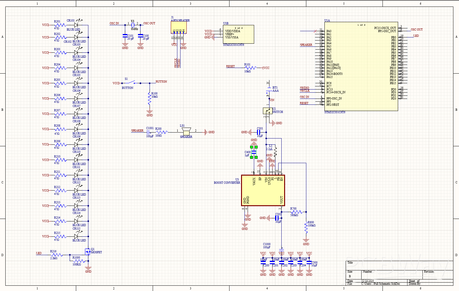 The MCU I chose was an STM32, which I'm clocking with an 8MHz crystal oscillator. The button and speaker are connected to GPIO pins in a standard configuration, and I've attached a 4-pin header for programming with an ST-Link. I'm planning on writing my code in C++ using MBED libraries as that's what I'm most familiar with. Also, to account for the current draw of the LEDs, I'm controlling them through a single GPIO pin with a MOSFET transistor as to not overload the chip.