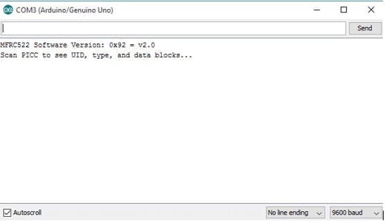 After having the circuit ready, go to File > Examples > MFRC522 > DumpInfo and upload the code. This code will be available in Arduino IDE (after installing the RFID library).