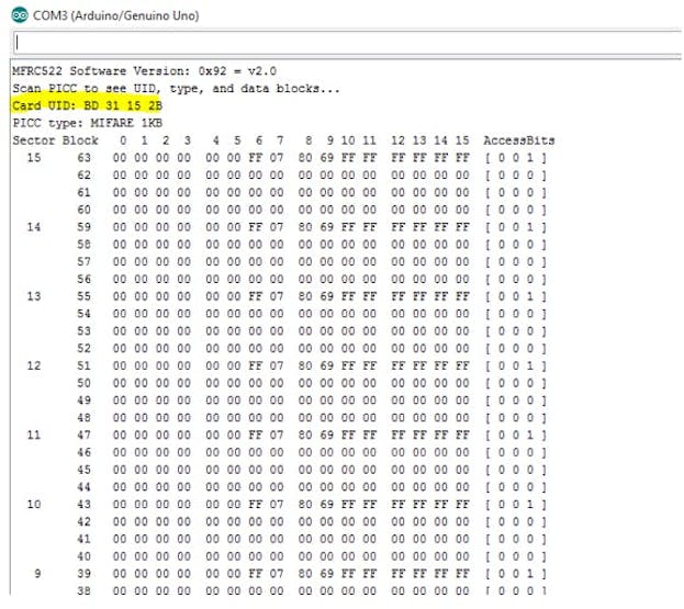 This is the information that you can read from the card, including the card UID that is highlighted in yellow. The information is stored in the memory that is divided into segments and blocks as you can see in the previous picture.