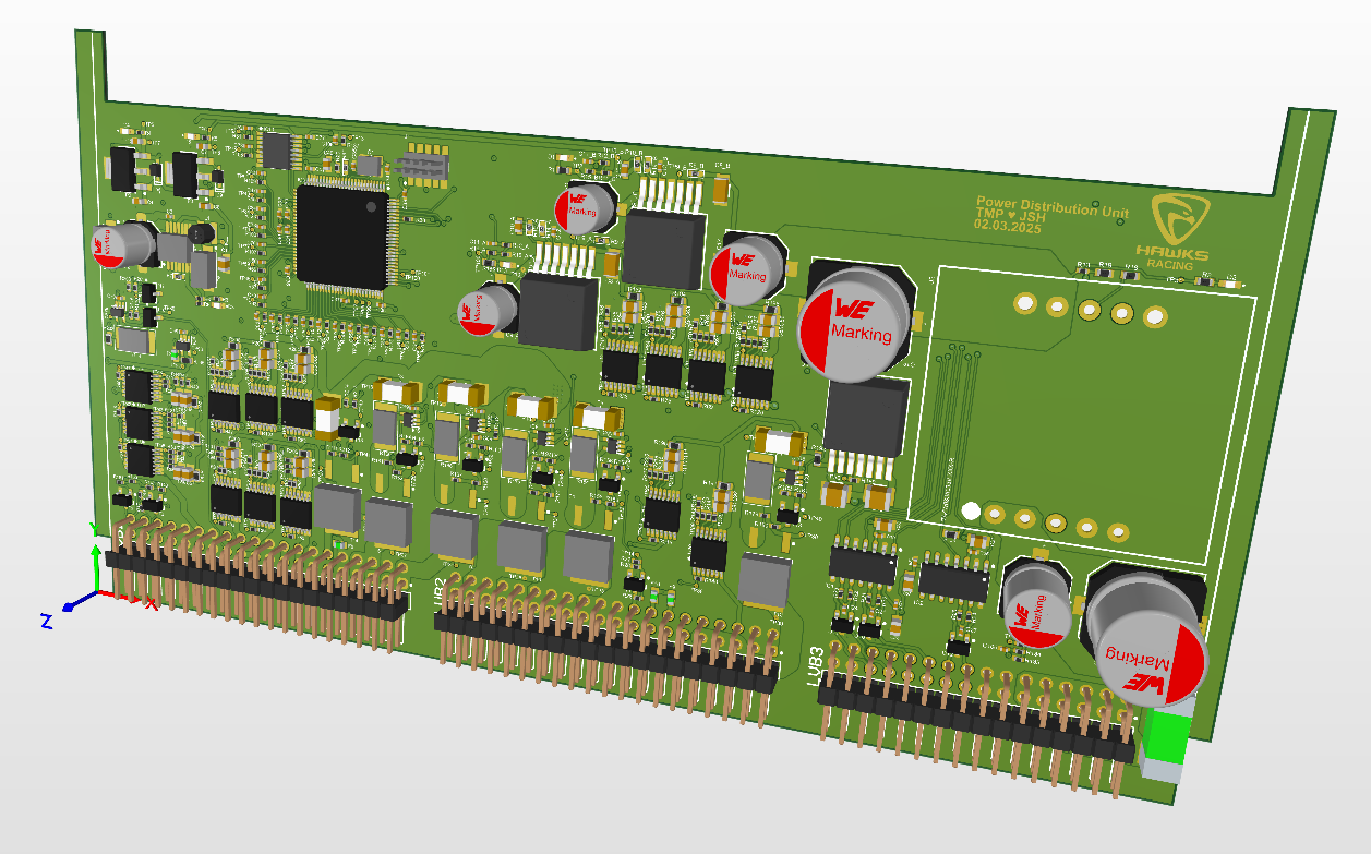 For example, here you can see our power distribution PCB, which supplies power to each of our electronic control units. It converts the main 37-volt supply into 24 volts and 12 volts as required by the individual ECUs. The PCB features active power monitoring and intelligent power channel switching, allowing us to not only control the distribution of power to each ECU but also track energy consumption in real time. This enables us to optimize the efficiency of our electrical system, quickly identify potential issues, and ensure reliable operation of all critical electronics during vehicle testing and racing.