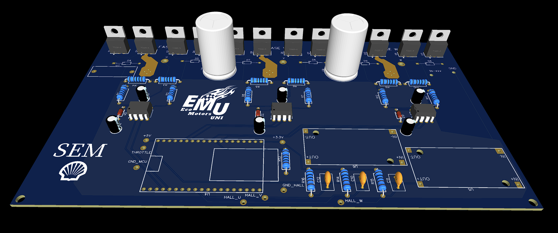 A project area that uses PCBs extensively is the department of Electronic Systems and Control. This part of the project is in charge of all the electronic circuits, control and energy system of the vehicle.There are two main PCBs needed in the vehicle, the MCU (Motor Control Unit) and the Electronic Speed Controller (ESC) for the Brushless DC Motor (BLDC).