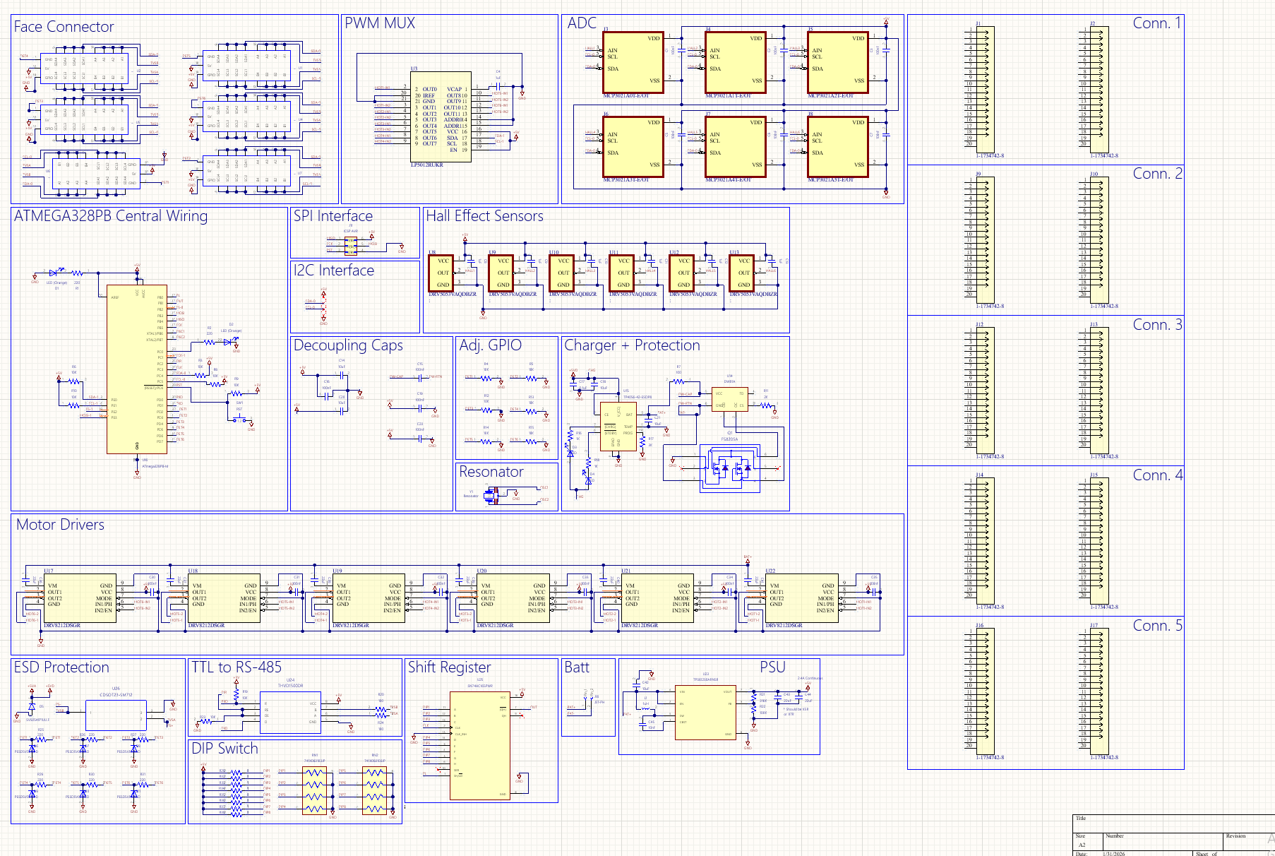 The microcontroller we're using for this project is the ATMega328PB (U16). Each module communicates with the system through wire (RS485 sneak peek!) so we don't need anything more complex. 2 I2C buses are exposed and 1 SPI bus is exposed for programming through ICSP, meaning we don't have to put an external FTDI chip on the board