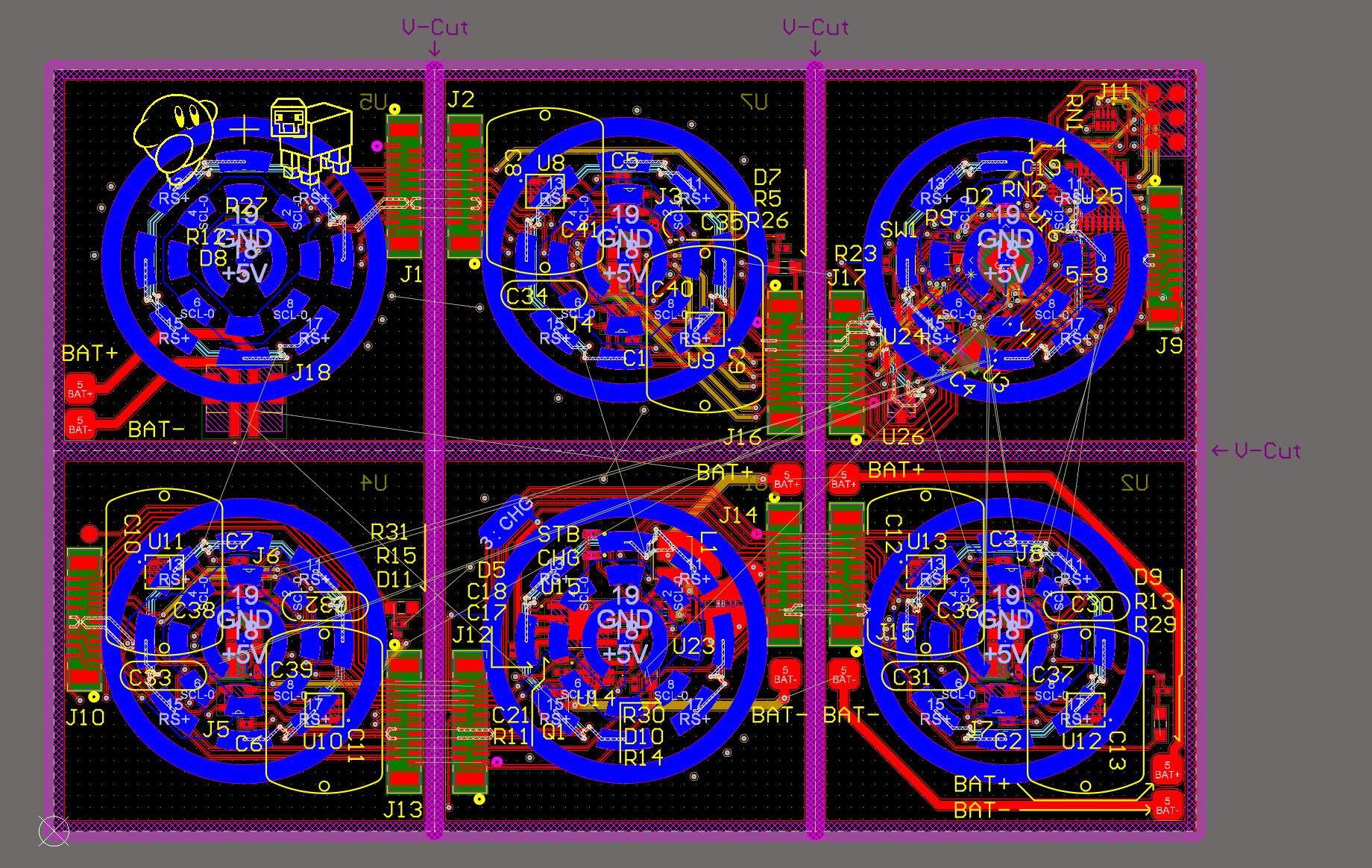 On the back of each module, there's a connection "face" made up of multiple levels of annular pads. (Looking at 2D PCB, it's the blue colored rings). We can transmit I2c, ground, power, and most importantly, RS485.