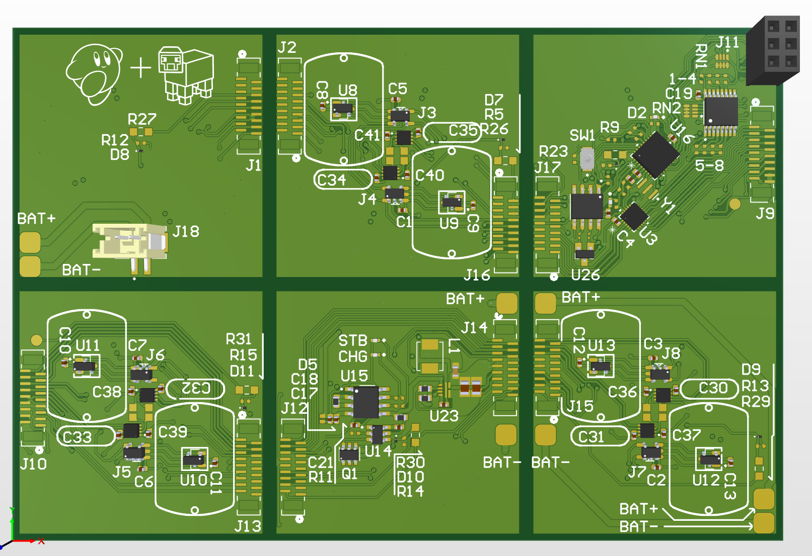 Since a 1S battery (connected through J18) will power the whole system, there needs to be a way to bring that up to 5V. Using a TI TPS boost converter (u23), a DW01A protection chip, (u14), and a tp4056 batt charging ic (u15), we're able to have charging, protection, and 5V boost all in one package.