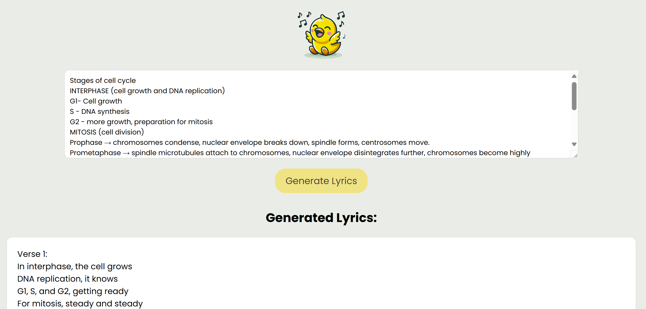 This is Paroduck, another project made by hackers that makes studying engaging and fun by merging your notes with catchy songs! Here's a link to their pitch: https://drive.google.com/file/d/1ekgAQavLso8Pc_5abeQHxENC-wpWUKEx/view?usp=sharing