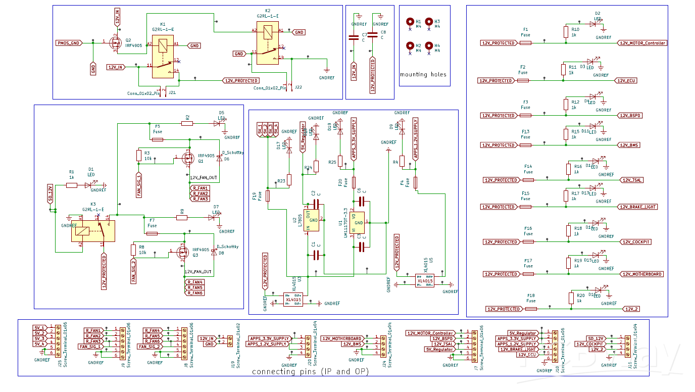 1. Power Distribution Unit (PDU): It is responsible for centralized and efficient power delivery to all electrical and electronic circuits present in the vehicle. It distributes regulated power to critical subsystems, including the Motor Controller, Battery Management System (BMS), Electronic Control Unit (ECU), brake light, safety circuits, indicator circuits, and auxiliary loads.