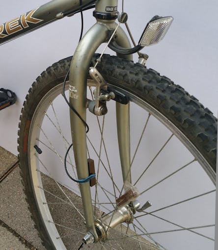 Reed switch wiring: I used the home security reed switch tied to the front wheel frame. Magnets secured to the wheel spool with groove cut into corners and sealed with duct tape.