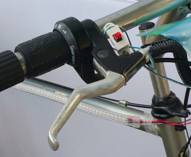 Break switch wiring: I wired a continuous close circuit loop that when a break in the handle bar will break the circuit. Interrupt will trigger all strip lights to red to warn tailing riders.